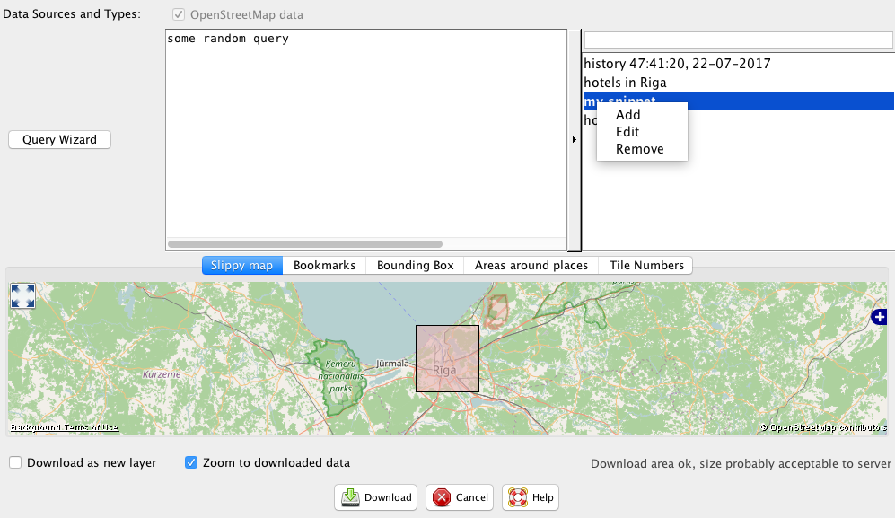 The Overpass Query Wizard tool is now represented in a separate dialog where some examples are provided, as well as a link to the wiki.