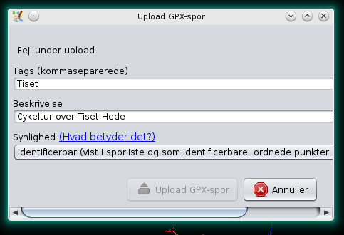 - Load GPX file into JOSM then try to upload it via "Upload Traces"