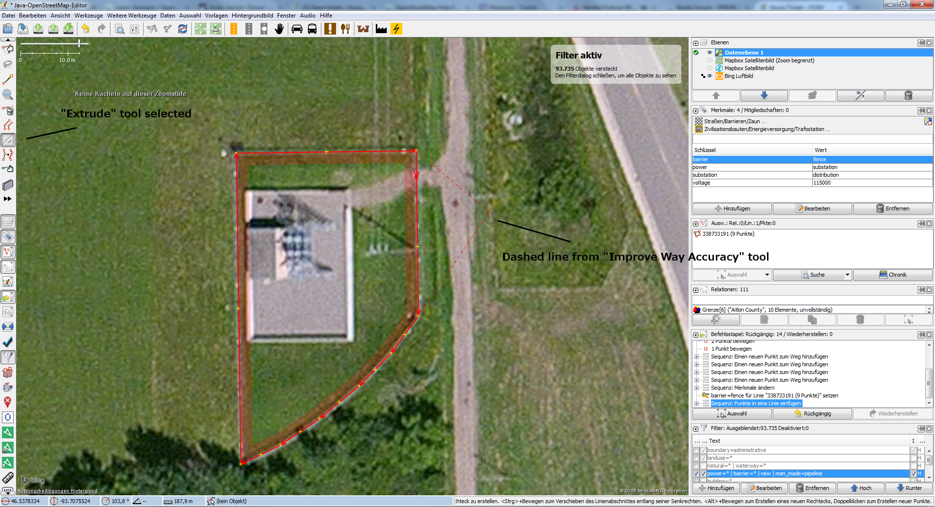 Dashed line from "Improve Way Accuracy" stays on map view when "Extrude" is selected