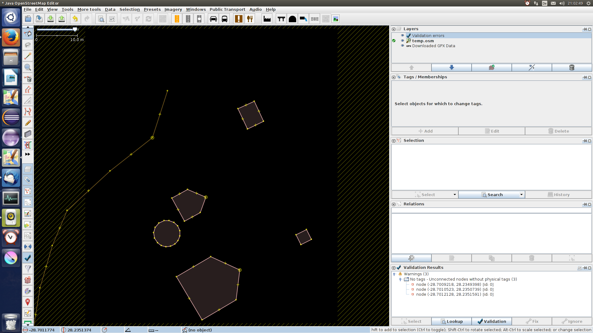 - Use the "Fix" method on warnings. The nodes disapear in a strange way: no node markes, but ways are following the deleted node (see fixed.png)