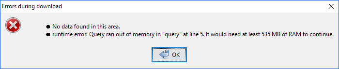 <?xml version="1.0" encoding="UTF-8"?> <osm version="0.6" generator="Overpass API 0.7.55.4 3079d8ea"> <note>The data included in this document is from www.openstreetmap.org. The data is made available under ODbL.</note> <meta osm_base="2018-08-30T12:46:02Z" areas="2018-08-30T12:40:02Z"/> <remark> runtime error: Query ran out of memory in "query" at line 5. It would need at least 535 MB of RAM to continue. </remark> </osm>
