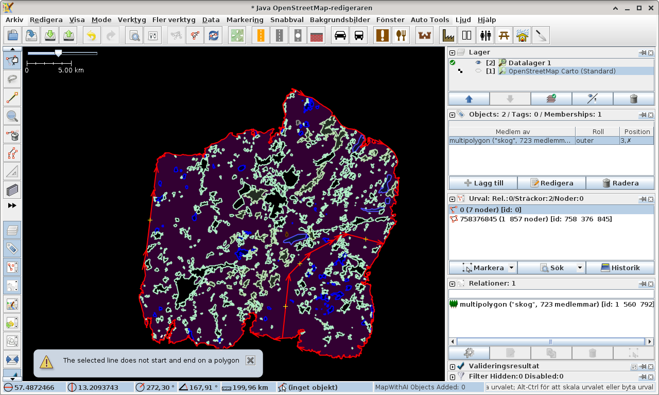 - Find one or more major roads or a river or a railway which connects the outer ring with one or more inners. An example might be the river Ätran described by relation 8928582 which cuts the given MP into two halves, or - probably better - some highways like O 1661 and O 1659 which "cut" a rather small triangle.