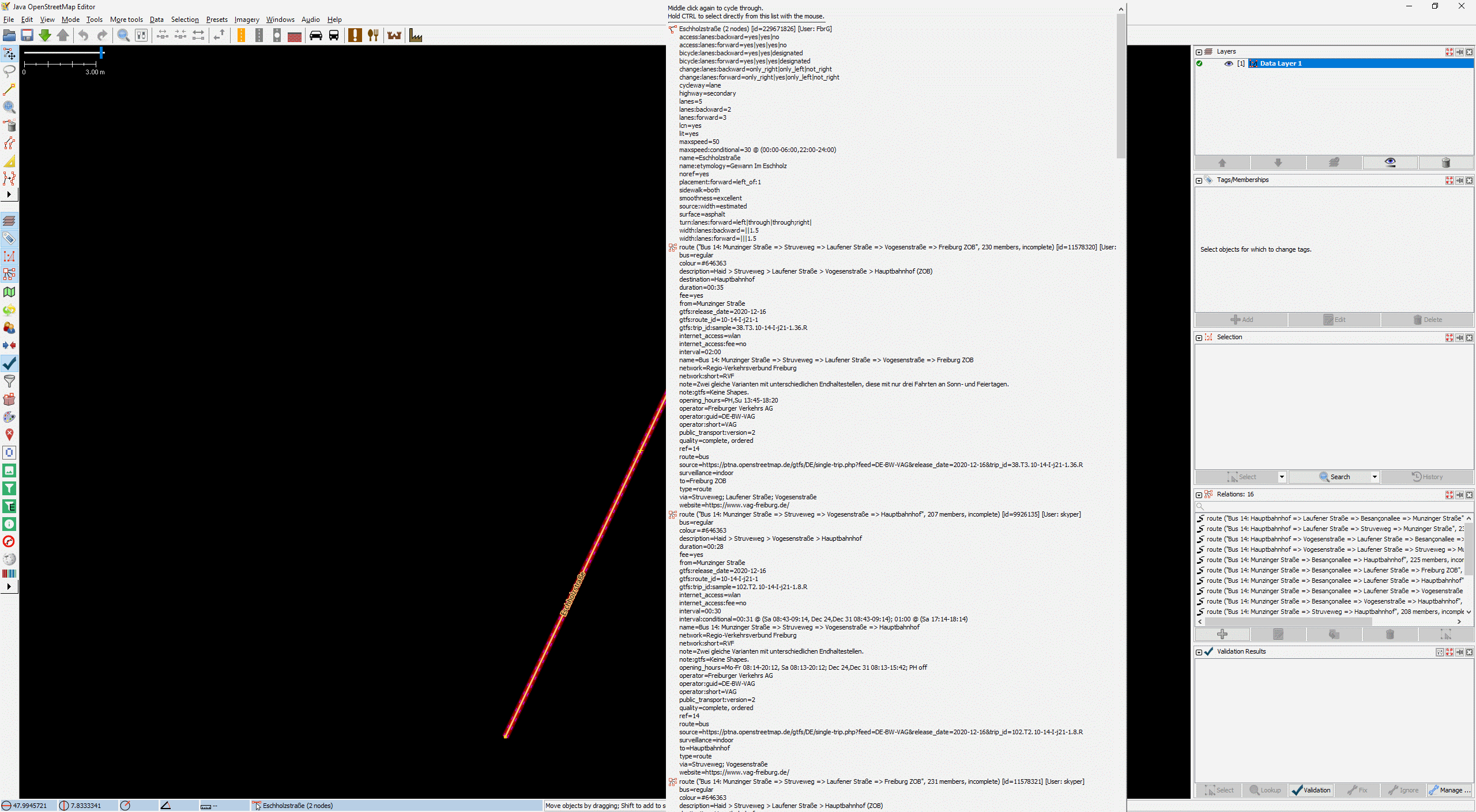 - Have overlapping ways with many tags (20+) or a way with some parent relations with many tags