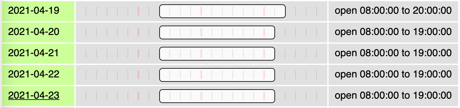Actual result with the wrong string, showing Mo-Fr: The extended hours on Th (22nd) are missing.