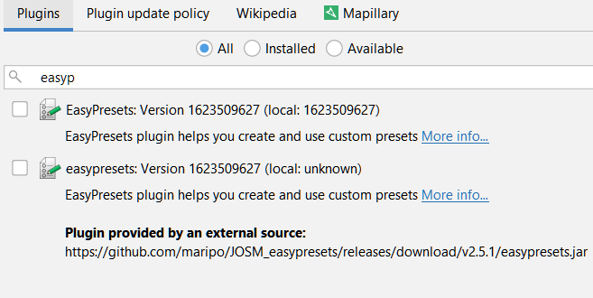 It looks like, indeed, JOSM is looking in both places, since there are both displays (the version is the same but one with "local: numVersion" and the other "local: unknown" - the "EasyPresets.jar" file was capitalized, created on March 22, 2021, modified on July 4, 2021)