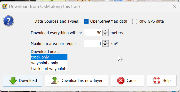 However, when I select my gpx and do "download from OSM along this track"