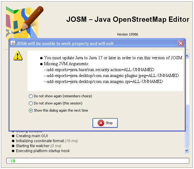 "Show this dialog again the next time" -> "Continue": JOSM starts