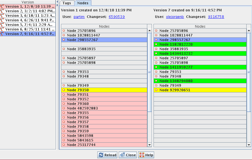 Currently, in the history dialog it is hard to see which nodes of a way have been added/removed/moved. One added node makes the subsequent list unreadable. See attached screenshot.
