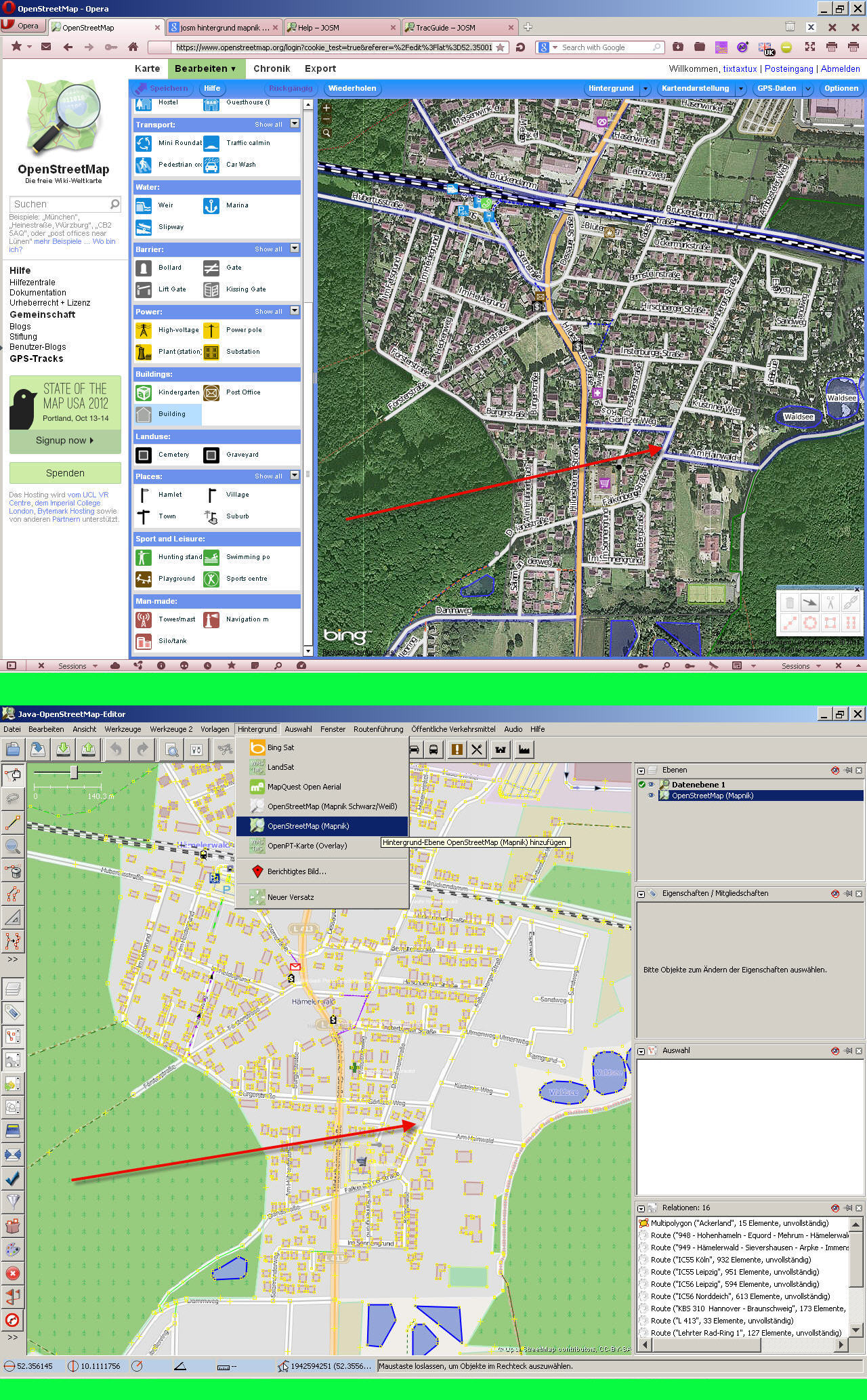 Auf der Webseite https://www.openstreetmap.org habe ich einen Strassenverlauf geändert. Um zu vergleichen wie aktuell die Daten sind habe ich in josm den gleichen abschnitt bearbeitet. Dabei ist mir aufgefallen, daß die änderung im Hintergrund OpenStreetMap (Mapnik) nicht aktuell ist. In der Drahtdarstellung wurde die Änderung übernommem.