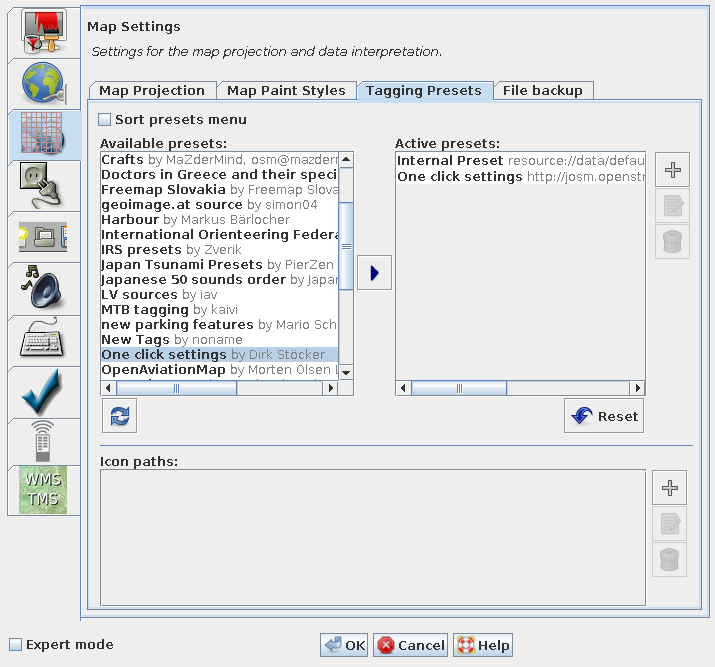 プリセット でオブジェクトにあらかじめ定義されたタグを付加できます。 ここではどのプリセットを使うか選択できます。
