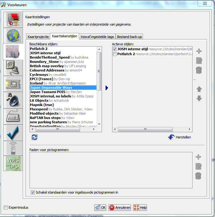 Opmerking: JOSM stelt bij het opstarten elke keer de methode voor projectie in, de indeling voor het weergeven van de coördinaten en de maateenheden, terug naar de standaard instellingen van de gebruiker.
