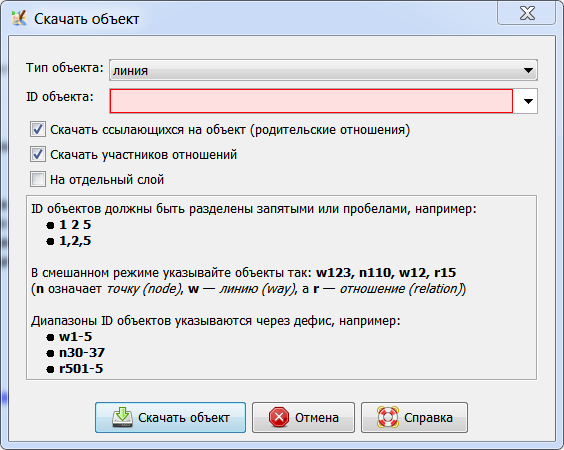 Загружает один или несколько объектов OSM (точки, линии или отношения) с сервера OSM в текущий или новый слой данных. Скачанные данные будут содержать точки линий для линий и (необязательно) любые линии или отношения, которые ссылаются на скачанный объект.
