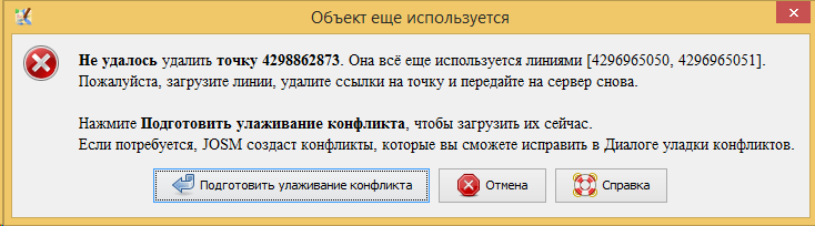 Если сервер ОСМ обнаружит что точка всё ещё используется, вы увидите следующее сообщение об ошибке: