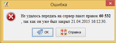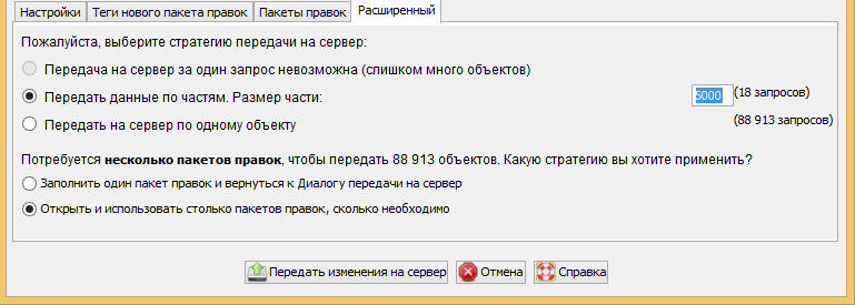 - Кнопка Продолжить передачу на сервер создаст необходимое количество новых пакетов правок и продолжит процесс