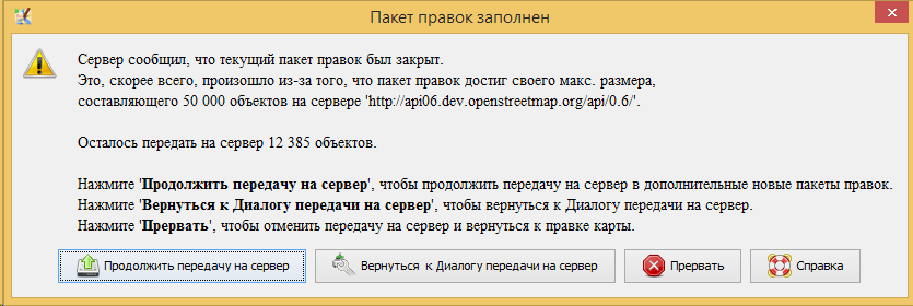 Существует предел размера пакета правок. В текущий момент ОСМ сервер поддерживает объем пакета в 10,000 правок. Если вы несколько раз передаете данные в один открытый пакет правок, вы можете превысить этот предел и увидеть такое сообщение: