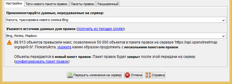 - JOSM автоматически создаст необходимое количество новых пакетов правок. Вмешательство пользователя не потребуется.