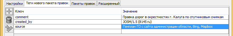 source, чтобы описать источник ваших правок (например:нарисовано по снимку Bing,по данным GPS треков и поездки на велосипеде). - Не нужно добавлять в теги ваше имя пользователя. На сервере OSM автоматически сохраняется связь между пакетами правок и создавшими их пользователями.